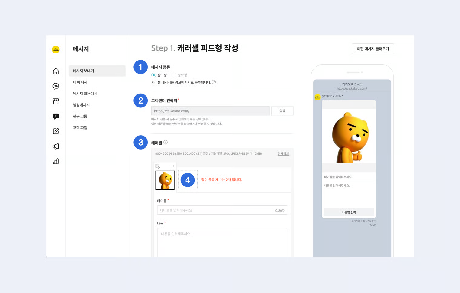 메시지(광고성/정보성 모두 포함) 전송 시 고객센터 연락처를 필수로 입력해야 합니다. \