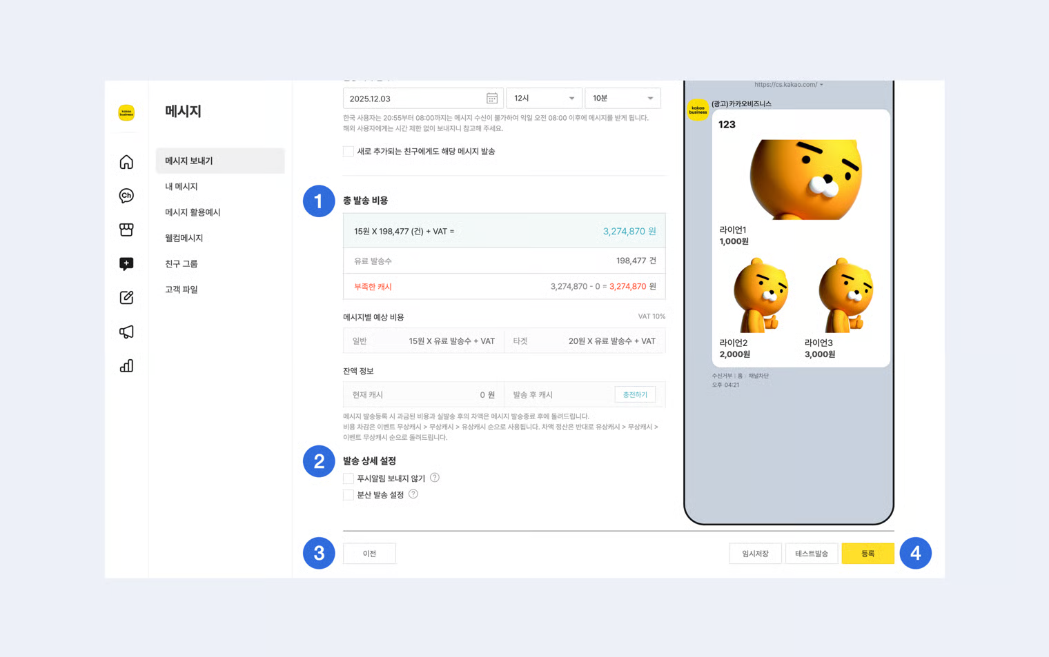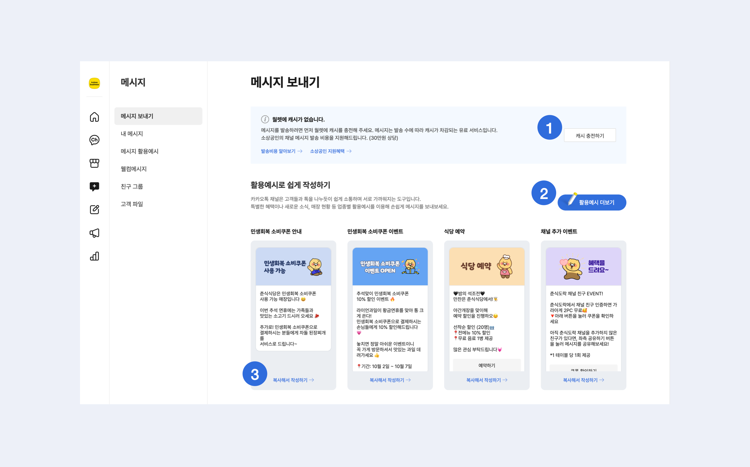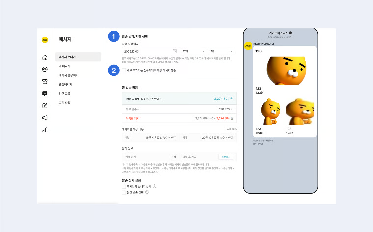 메시지는 발송 수 에 따라 캐시가 차감되는 유료 서비스입니다. ([발송비용 알아보기](https://kakaobusiness.gitbook.io/main/channel/run/message#1-2.))\