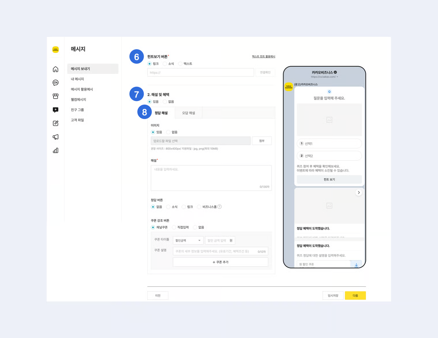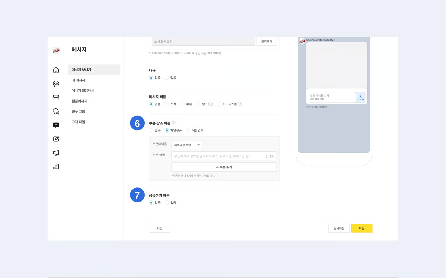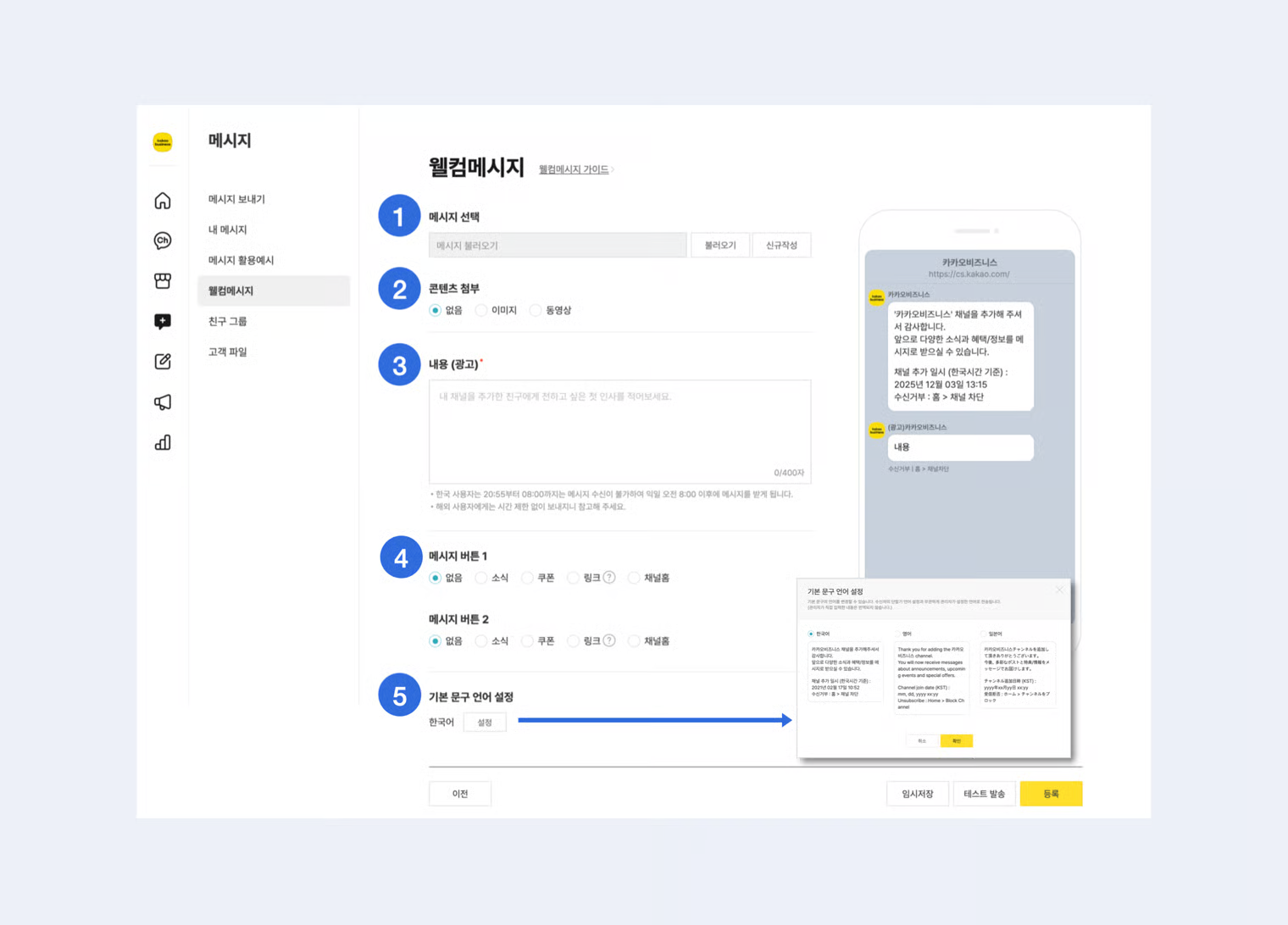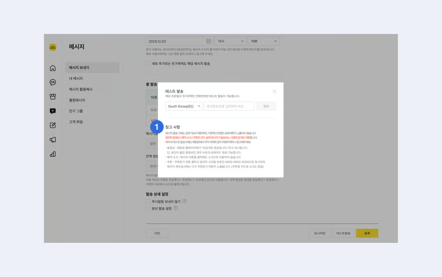 * 채널 메시지 집행 가이드에 근거하여 비속어, 음란/성인, 혐오, 불법 등 약관, 운영정책 및 가이드에 위반되는 내용은 메시지 작성 및 발송이 불가합니다.