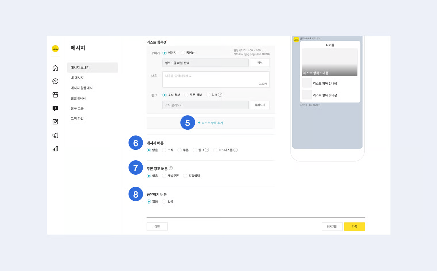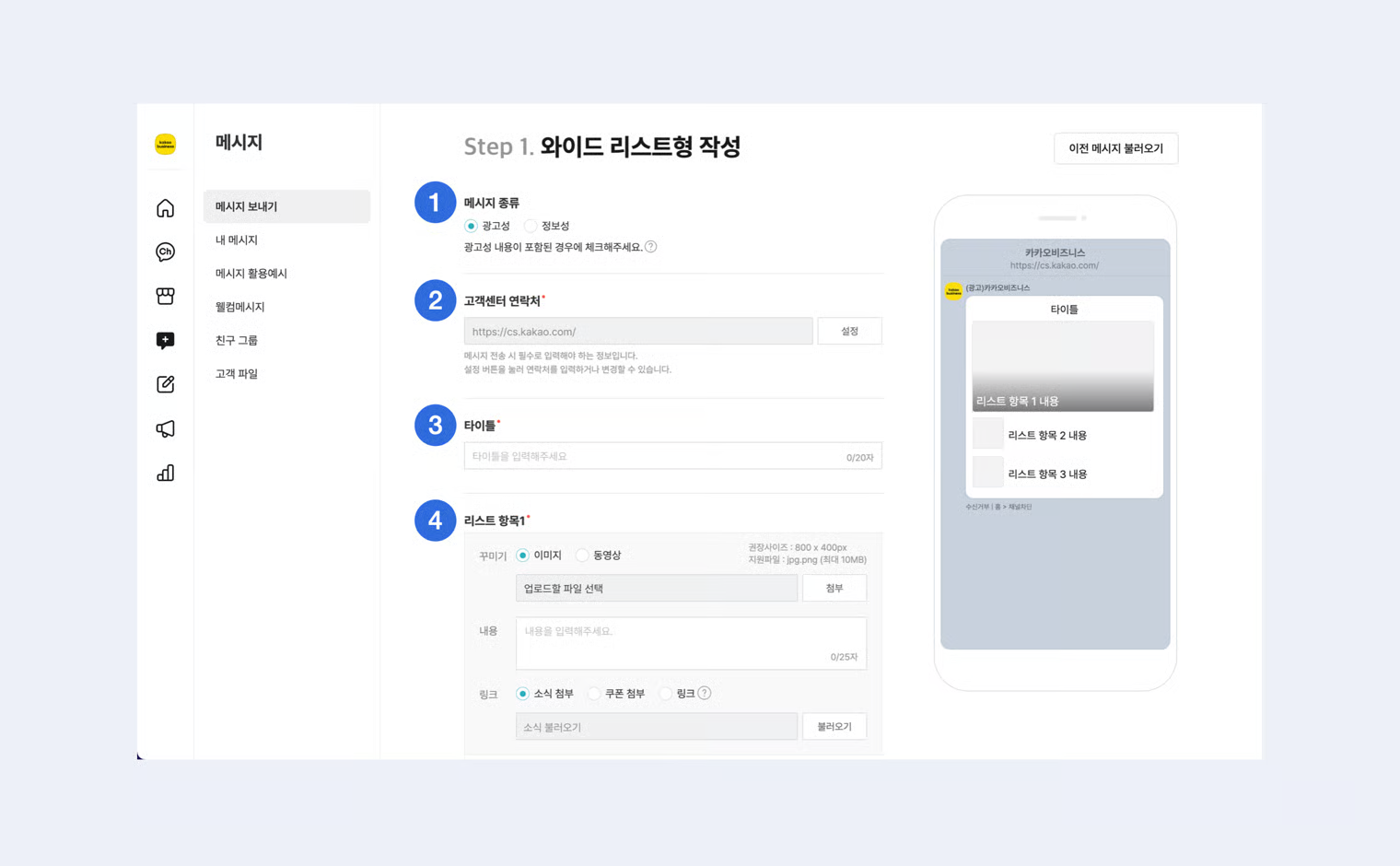 리스트는 4개까지 추가 가능하며, 메시지 버튼 1개를 추가할 수 있습니다.\