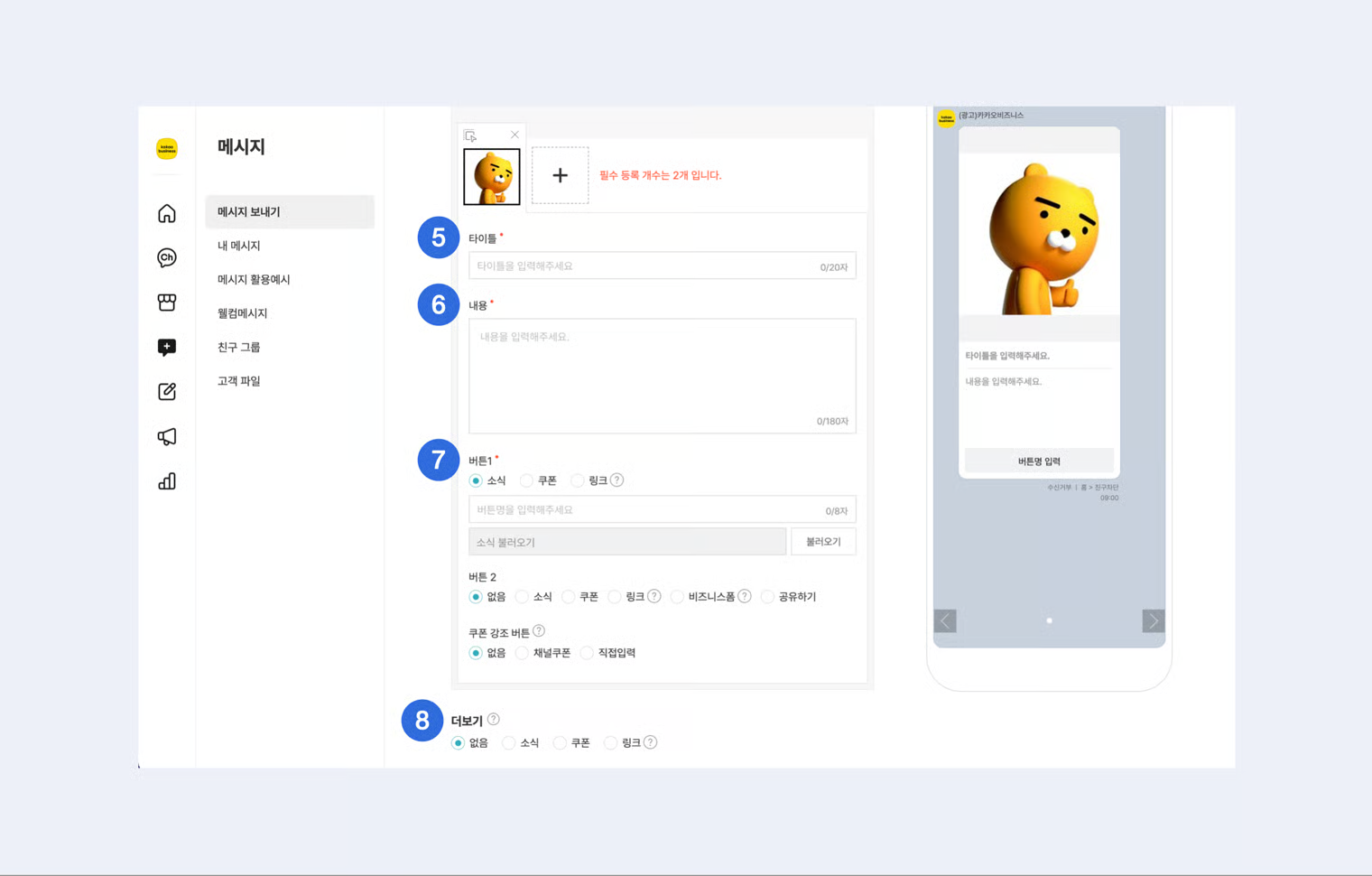 텍스트를 최대 400자까지 입력할 수 있으며, 이미지 또는 동영상 1개, 메시지 버튼 2개를 추가할 수 있습니다.\