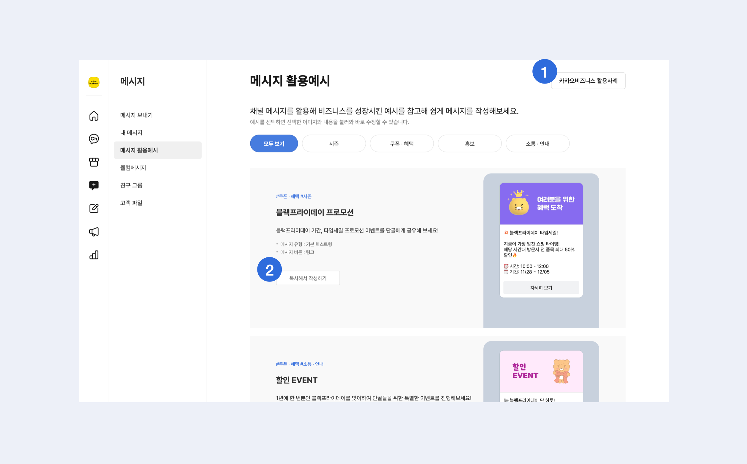 [Kakao business 활용사례](https://t1.daumcdn.net/biz/bizseminar/kakaobusinesss_seminar_casestudy_vol.1.pdf)를 통해 다양한 비즈니스 활용 사례를 확인하여 메시지 작성에 참고해 보세요. \