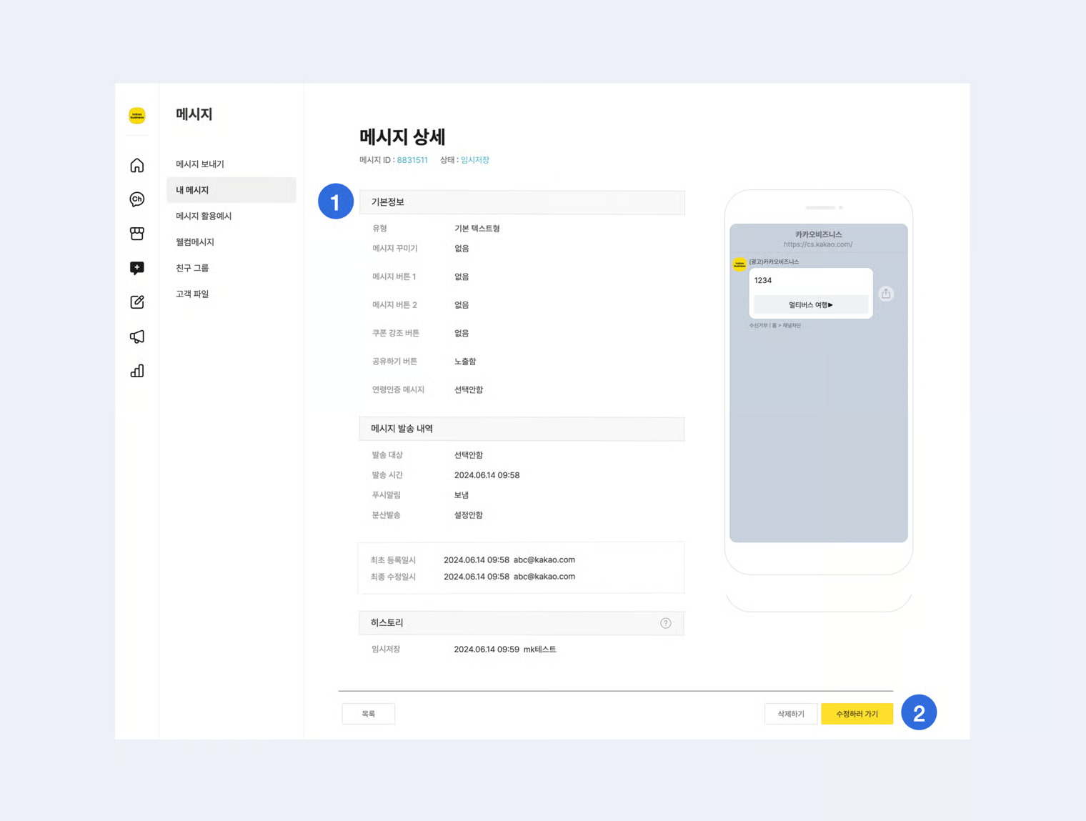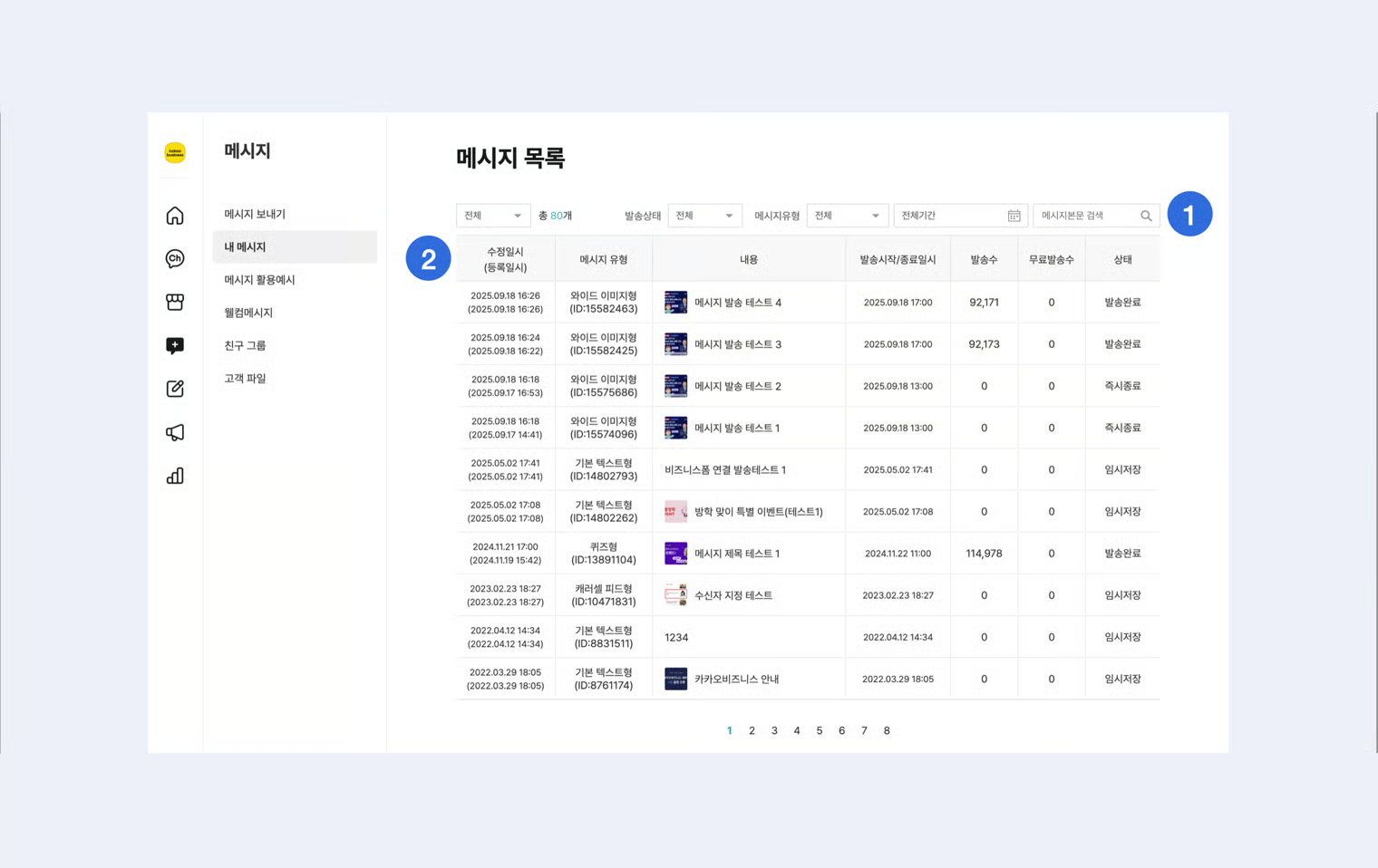 메시지 목록에서는 작성한 모든 메시지를 상태별, 유형별, 기간별로 확인할 수 있습니다.&#x20;