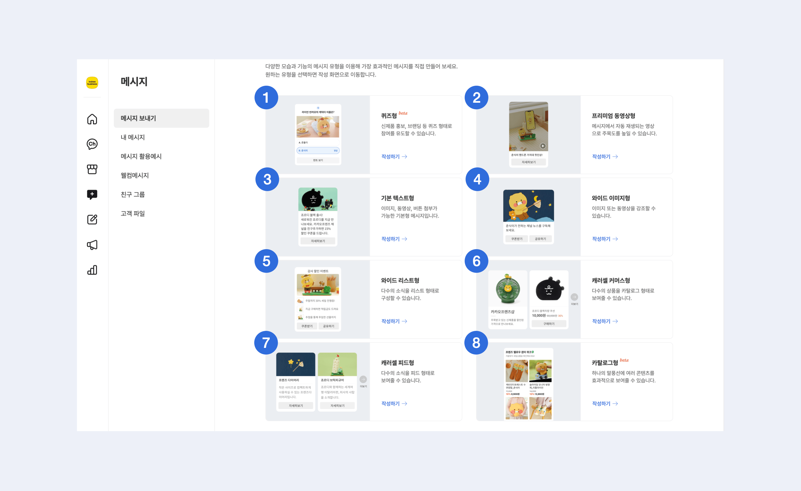 전달할 콘텐츠의 속성에 따라 메시지 유형을 선택하여 직접 작성해 보세요. \