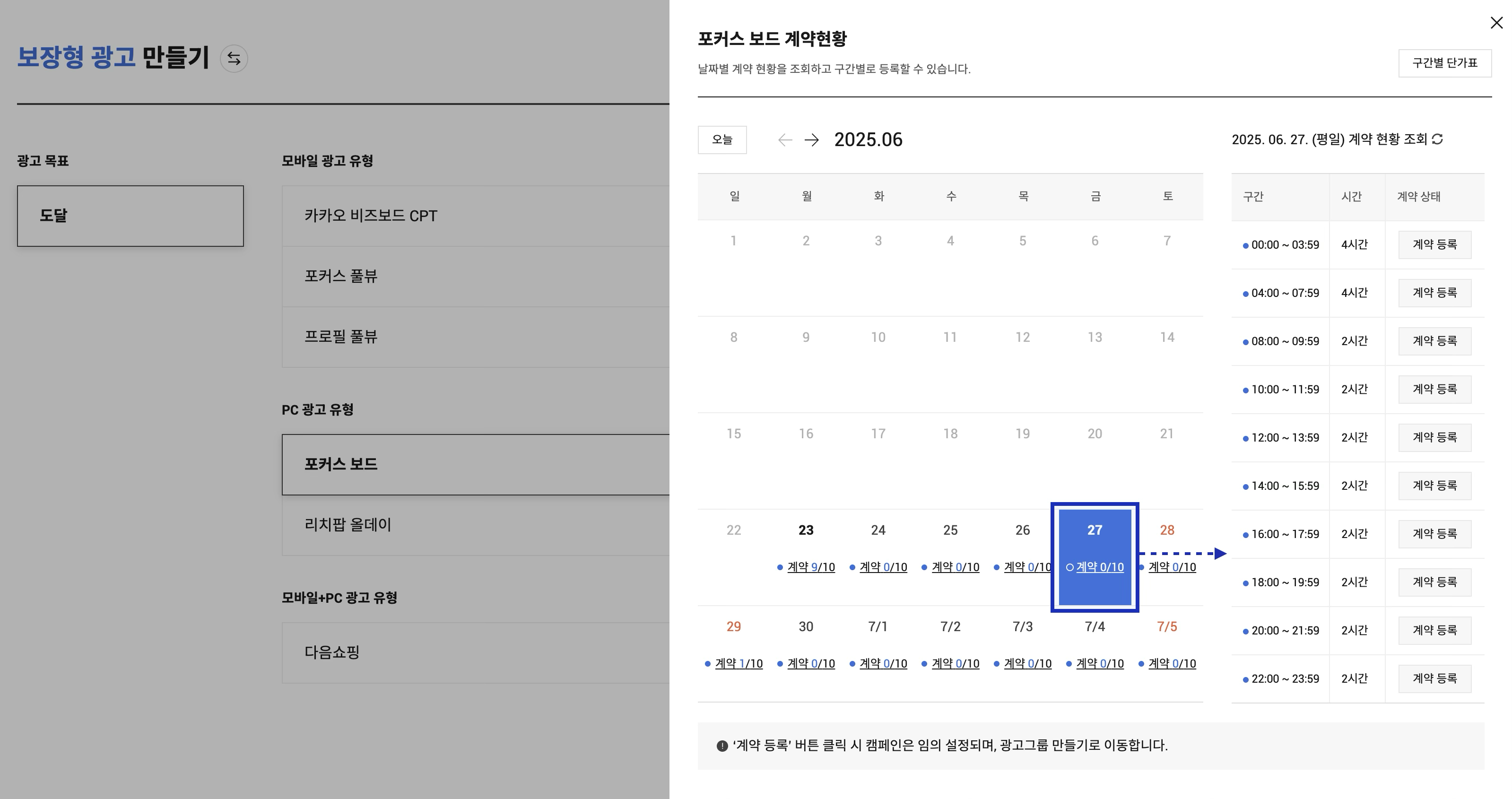 캠페인 생성 전 [계약 현황] 버튼을 통해 청약 일정 및 구좌별 계약 등록 현황을 확인할 수 있으며, 계약 가능한 구좌의 [계약 등록] 버튼 클릭 시 선택한 구좌 정보가 세팅된 광고그룹으로 이동합니다.