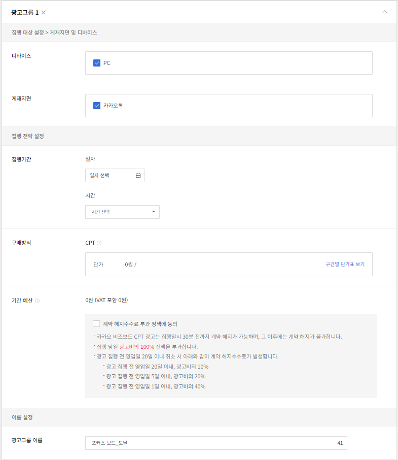 위약금/계약 해지 수수료 부과 정책을 확인한 후 동의를 클릭해 주세요. 광고그룹 설정을 완료하기 위해서는 동의가 필수입니다.