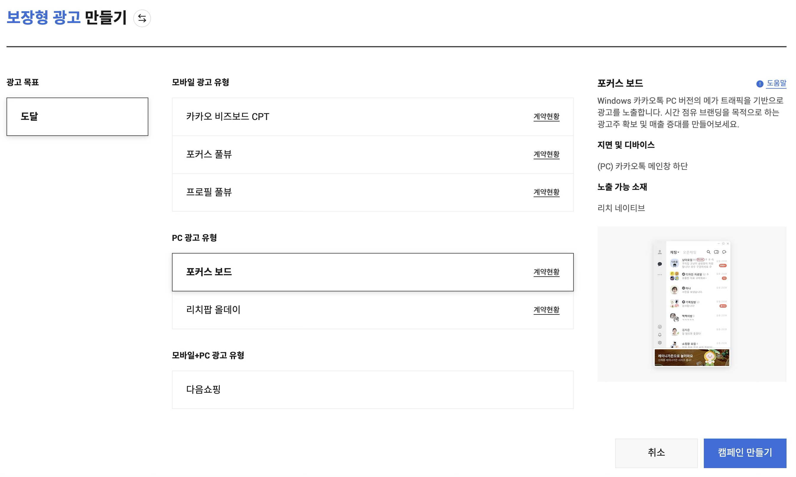 Step 3. 광고 목표에서 [도달]을 선택하고 광고 유형 [포커스 보드] 선택 후 [캠페인 만들기] 버튼을 눌러주세요.