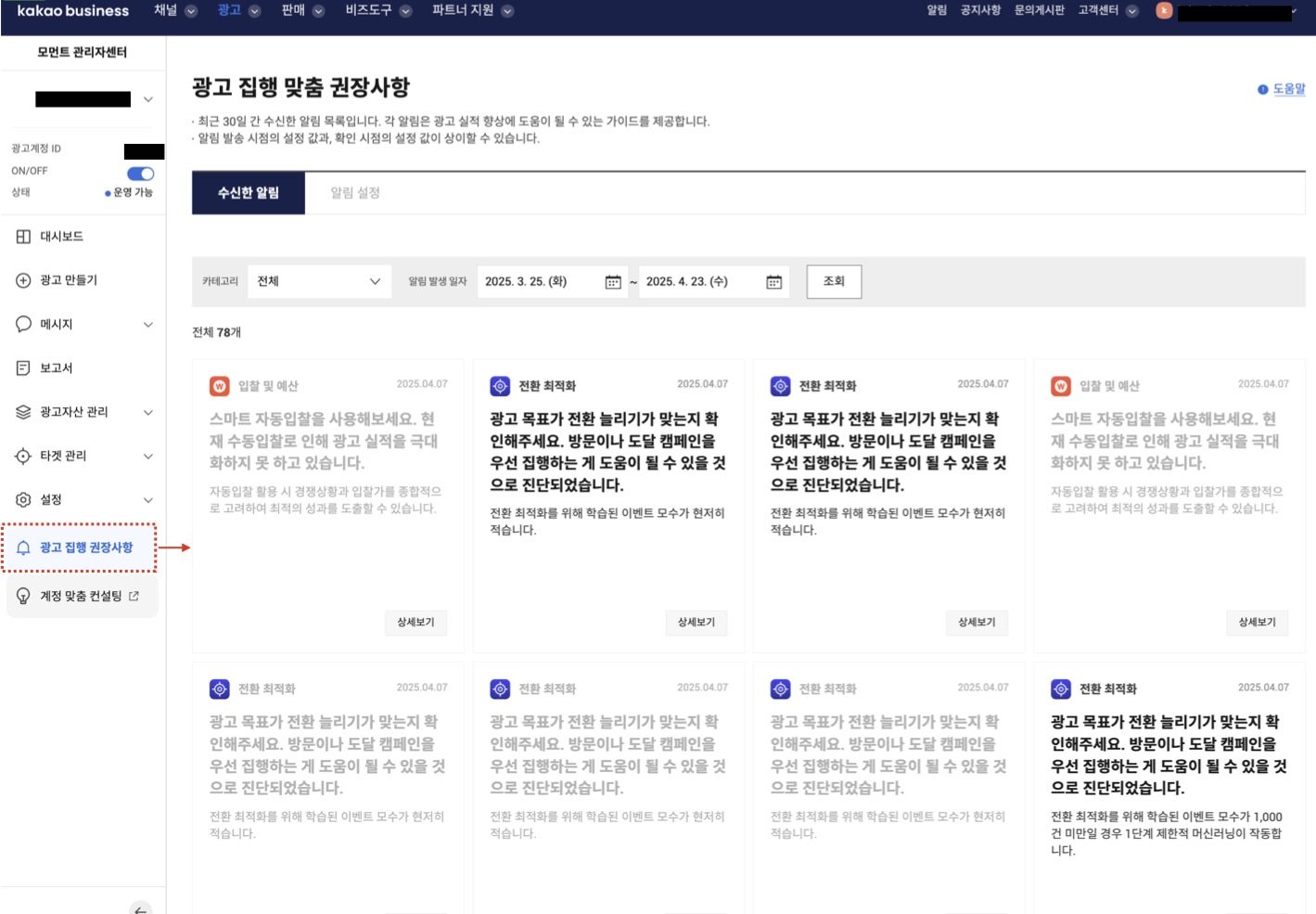 각 알림에서는 광고 성과를 개선할 수 있는 대상과 방법을 안내합니다.