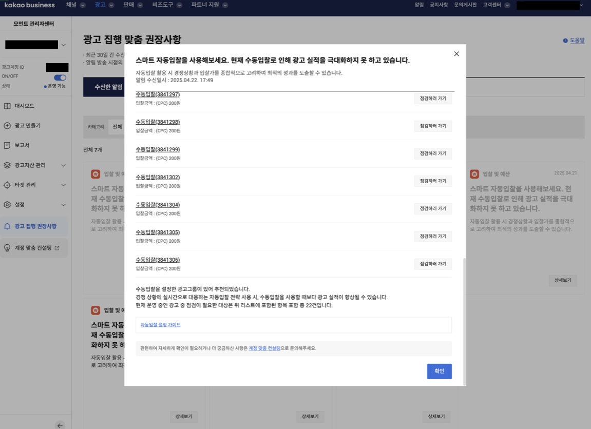 ## 3. 광고 집행 권장사항에서 확인하기