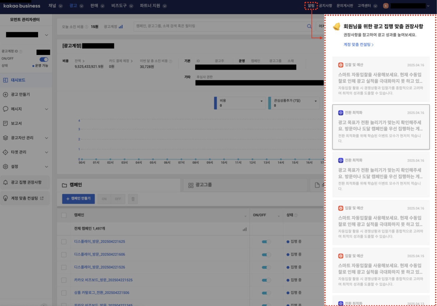 카카오모먼트에서 집행 중인 광고 현황을 기반으로, 성과를 개선할 수 있는 방안에 대해 알림을 발송해주는 서비스입니다.