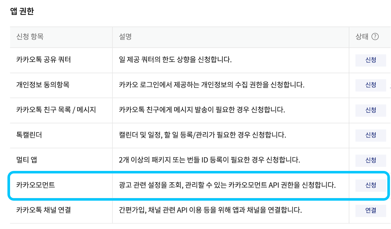 3-1) 모먼트 API 권한 신청 : 디벨로퍼스 > 내 애플리케이션 > 앱 설정 > 앱 권한 신청 > 카카오모먼트 신청