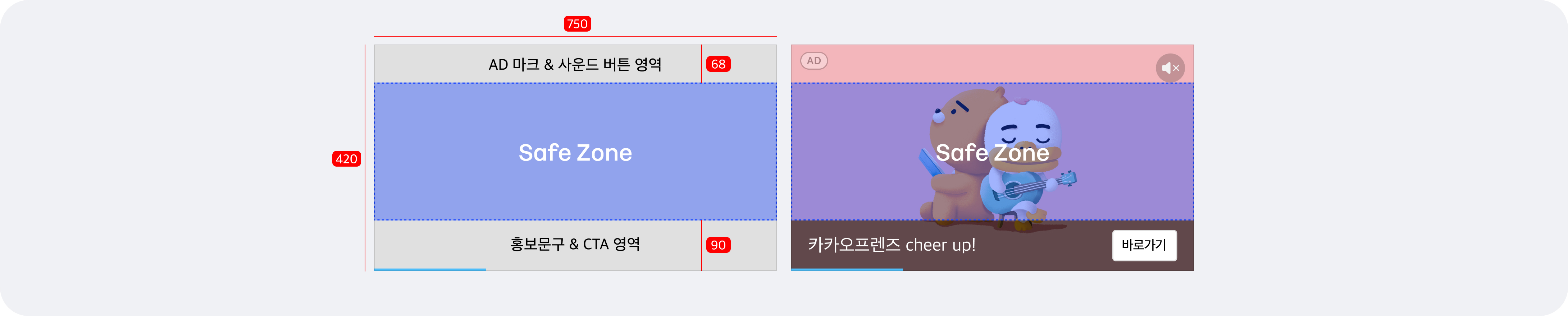 노출되는 게재지면에 따라 동영상의 상/하/좌/우 일부가 잘리거나 가려질수 있으며, 디바이스 해상도에 따라 면적이 달라질 수 있습니다. 주요 요소(텍스트, 로고, 필수고지문구, 메인 오브젝트 등)는 상/하 89px 및 좌/우측 47px 영역이 아닌 중앙 영역에 배치하도록 제작해야 합니다. 타 UI와 겹침 없이 저해상도 디바이스에서도 안전하게 노출을 희망하는 경우에는 상단 279px, 하단 438px 영역에 주요 텍스트 및 메인 오브젝트가 사용되지 않도록 제작하시길 권장합니다.