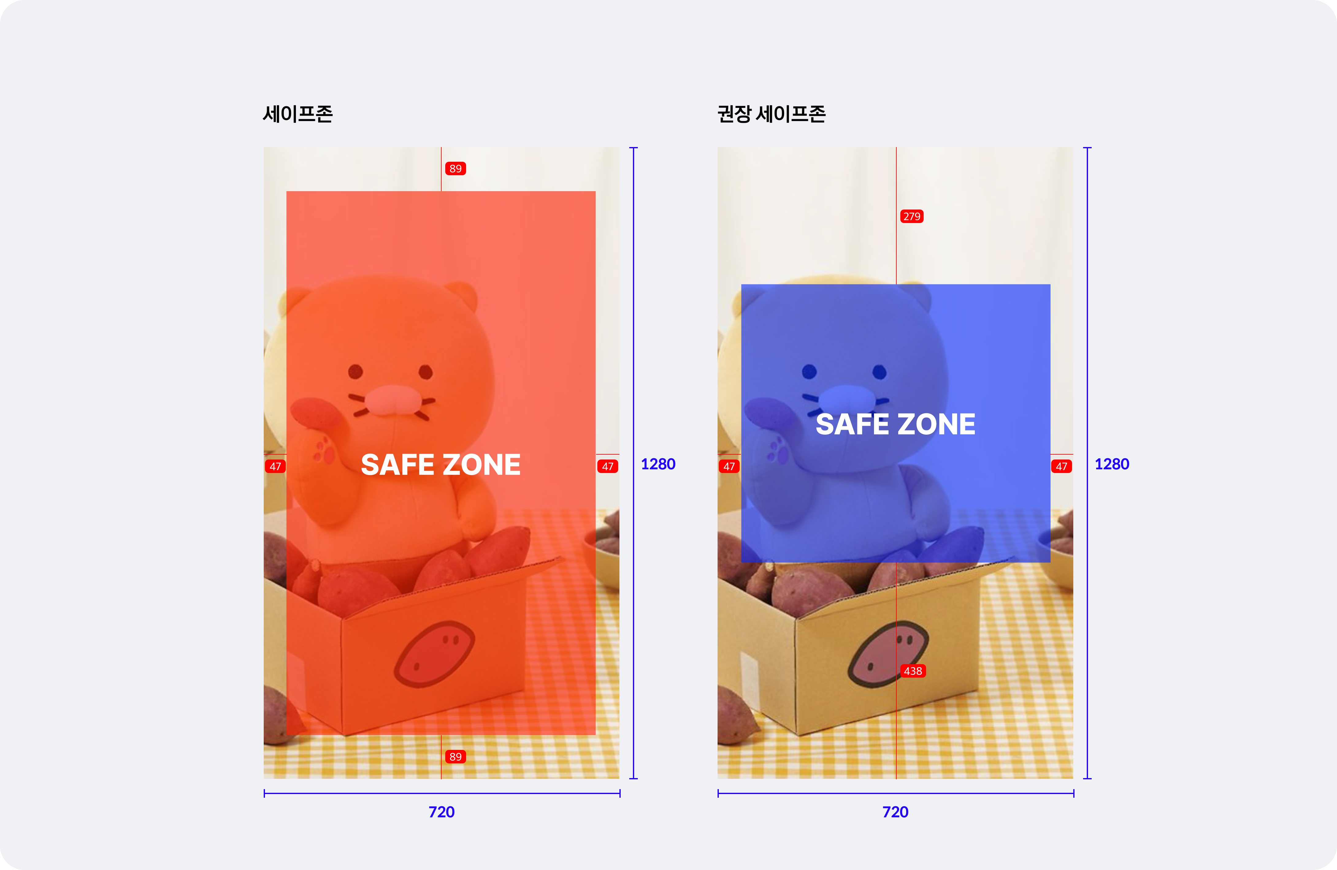 SAFE ZONE의 px값은 제작가이드에서 안내하는 기본 사이즈 기준이며, 만약 기본 사이즈보다 큰 이미지를 사용한다면 SAFE ZONE도 같은 비율로 확대 적용이 필요합니다.