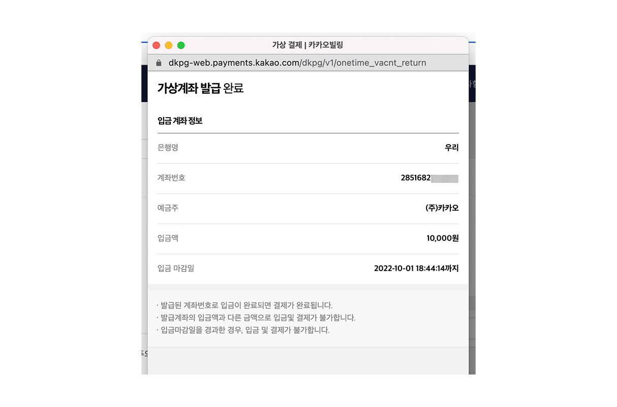 가상계좌는 발급 당시 화면에서 확인할 수 있습니다.