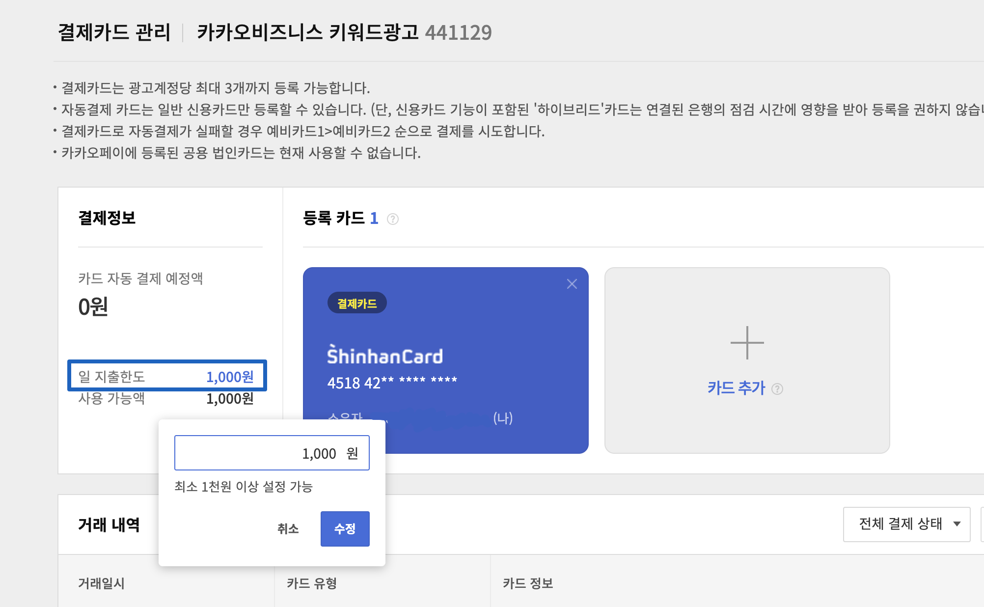 1) 자동결제에 한하여 하루에 설정해 놓은 금액 이상으로 결제되지 않도록 일 지출한도 설정이 가능합니다. 2) 일 지출한도는 1천 원 이상 1억 원 이하의 1천 원 단위로만 입력합니다. 3) 일 지출한도에 도달하면 광고는 자동으로 OFF되며, OFF 시점에 노출된 광고에 대해서는 초과 과금이 발생 할 수 있습니다.