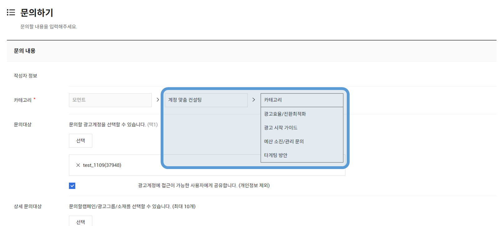 \- 문의 유형 (예산 소진 / 효율 관리 방안 / 타게팅,최적화 방안 중 선택) \