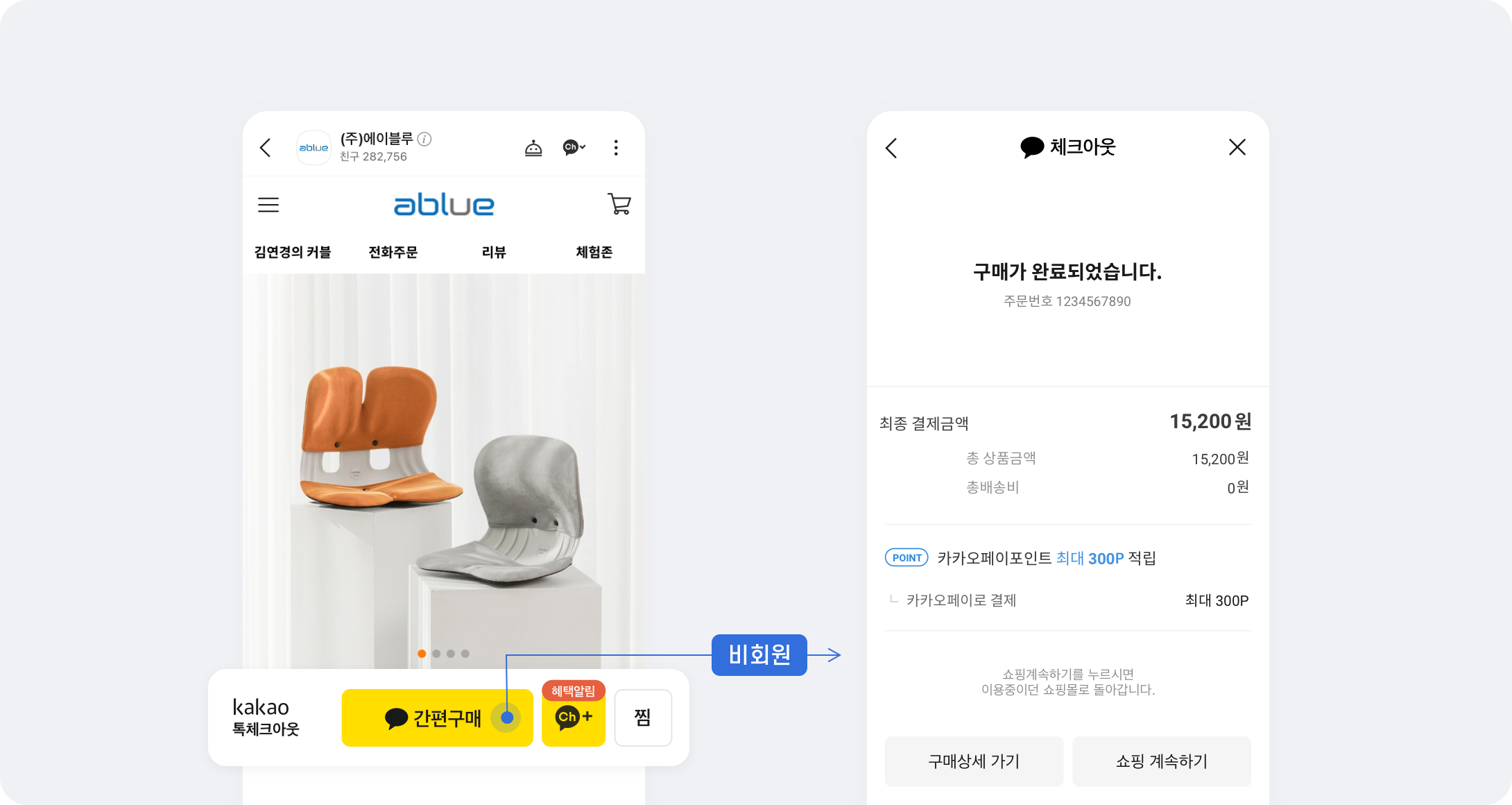 톡체크아웃은 회원가입/ 로그인 없이 간편하게 결제할 수 있는 수단이며, 비회원 구매 시 채널 친구까지 확보할 수 있는 마케팅 수단입니다. 별도 개발 없이 톡체크아웃 제휴 호스팅사를 사용 중인 쇼핑몰일 경우 쉽고, 빠르게 연동이 가능합니다.