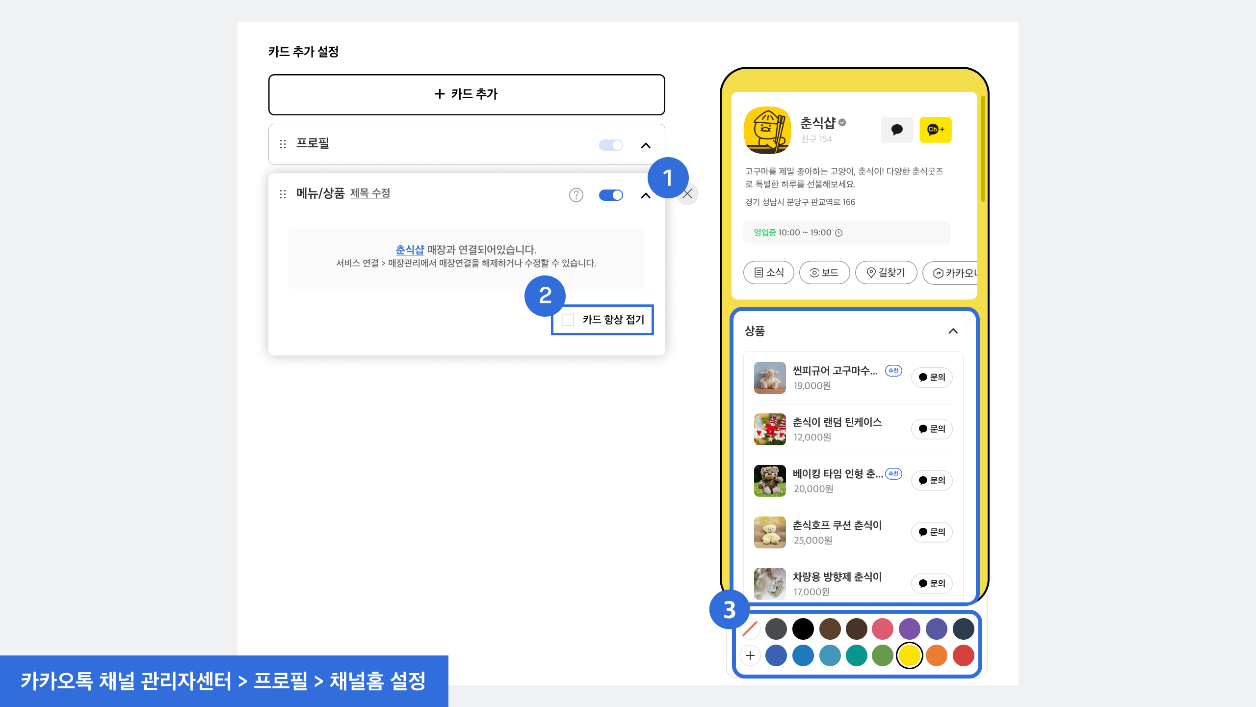 카카오맵 매장관리 서비스와 연동된 채널의 경우 메뉴/상품 카드를 통해 채널홈에 노출할 수 있습니다.