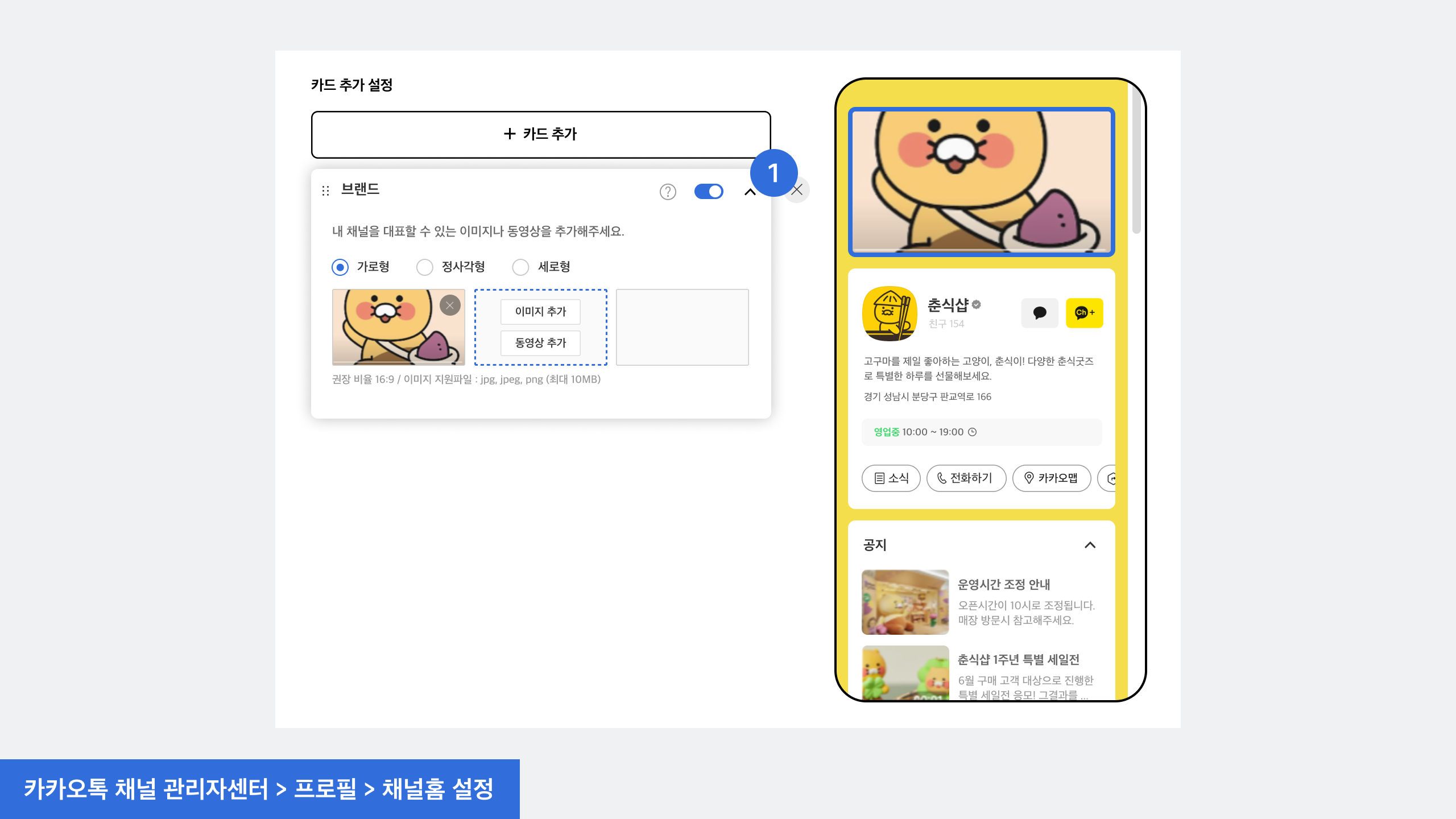 브랜드 카드를 설정하기 위해서는 채널이 비즈니스 채널이어야만 사용하실 수 있습니다. 해당 카드를 이용하고자 하시는 경우에는 먼저 비즈니스 채널로 전환해 주시기 바랍니다.&#x20;