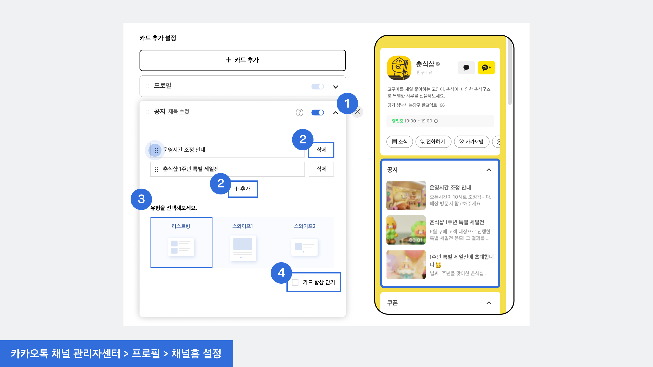 ➊ **공지 카드 설정하기**