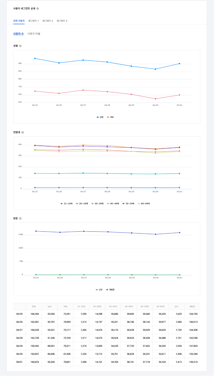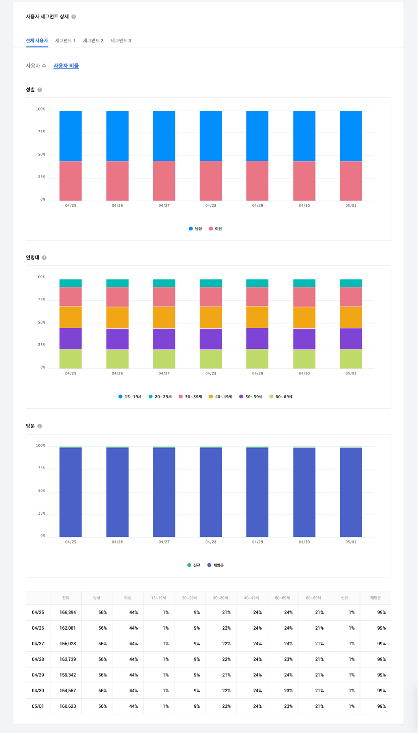 설정된 사용자 세그먼트 중에서 특정 사용자 세그먼트의 일별 성별 / 연령대별 / 방문 유형별 사용자 수와 비율을 그래프와 도표에서 확인할 수 있습니다.