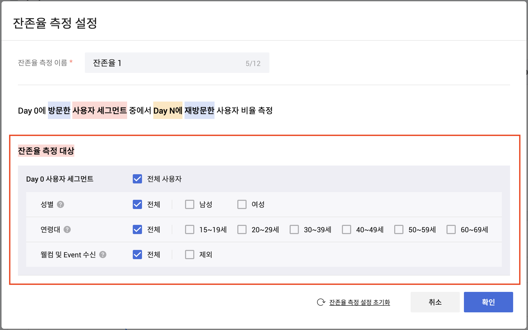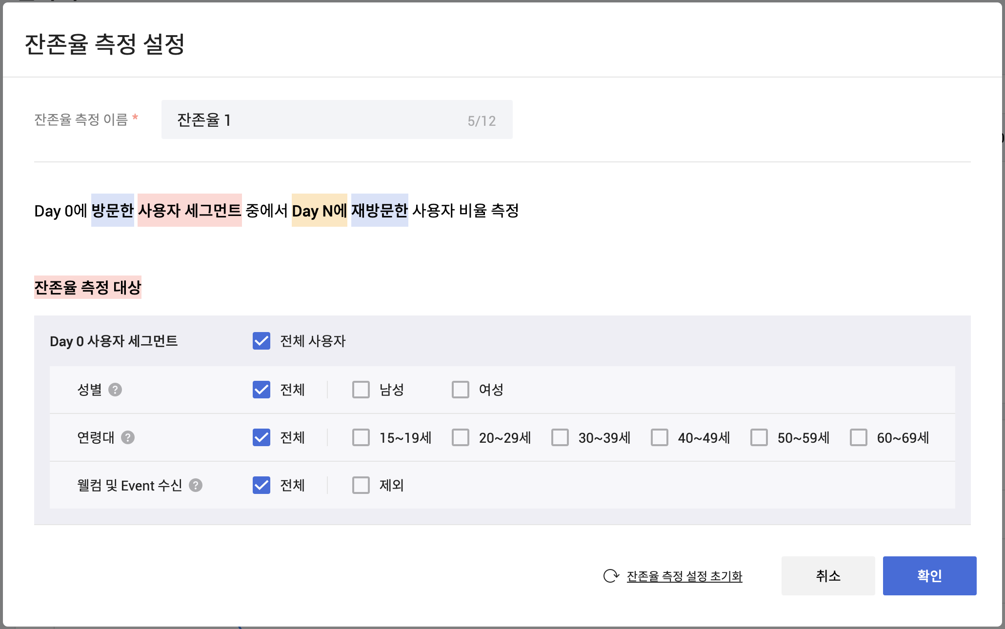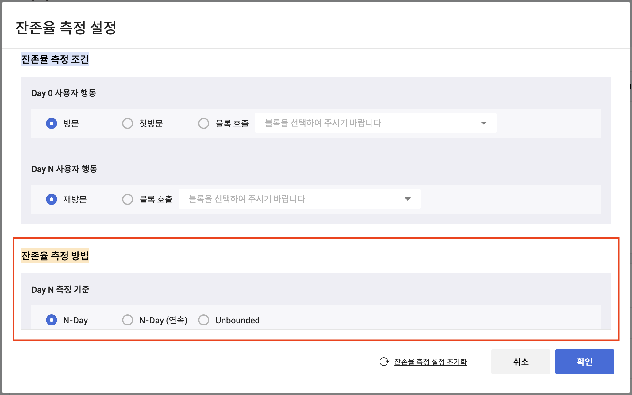 ### 잔존율 측정 설정 <a href="#setting_retension_measurement" id="setting_retension_measurement"></a>