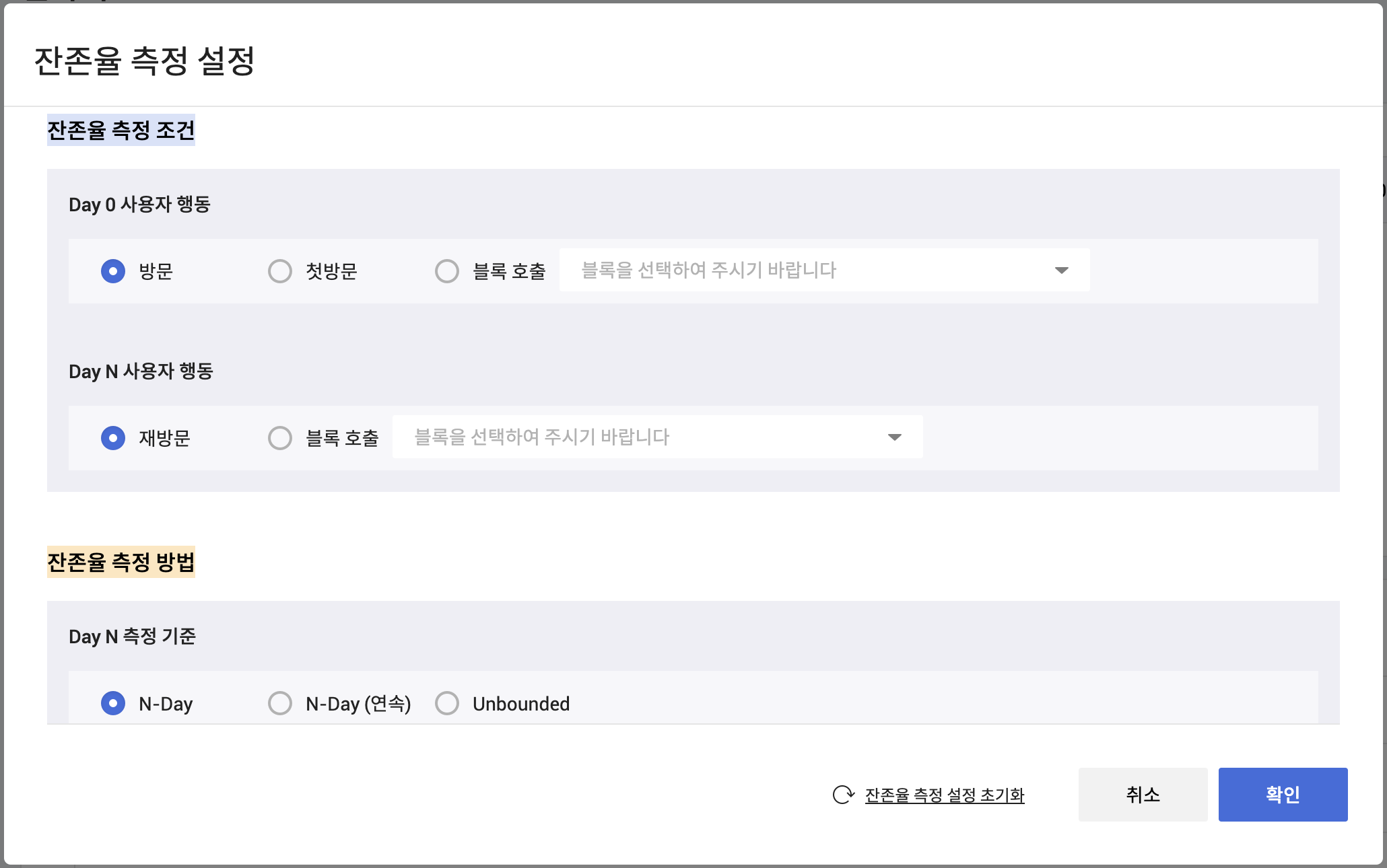 * 잔존율 측정 조건의 Day 0 사용자 행동을 ‘방문’ 또는 ‘첫방문’으로 설정하면 Day N 사용자 행동은 ‘재방문’으로, Day 0 사용자 행동을 ‘블록 호출’로 설정하면 Day N 사용자 행동은 ‘블록 호출’로 자동 설정되며, Day N 사용자 행동의 별도 설정은 불가능합니다.
