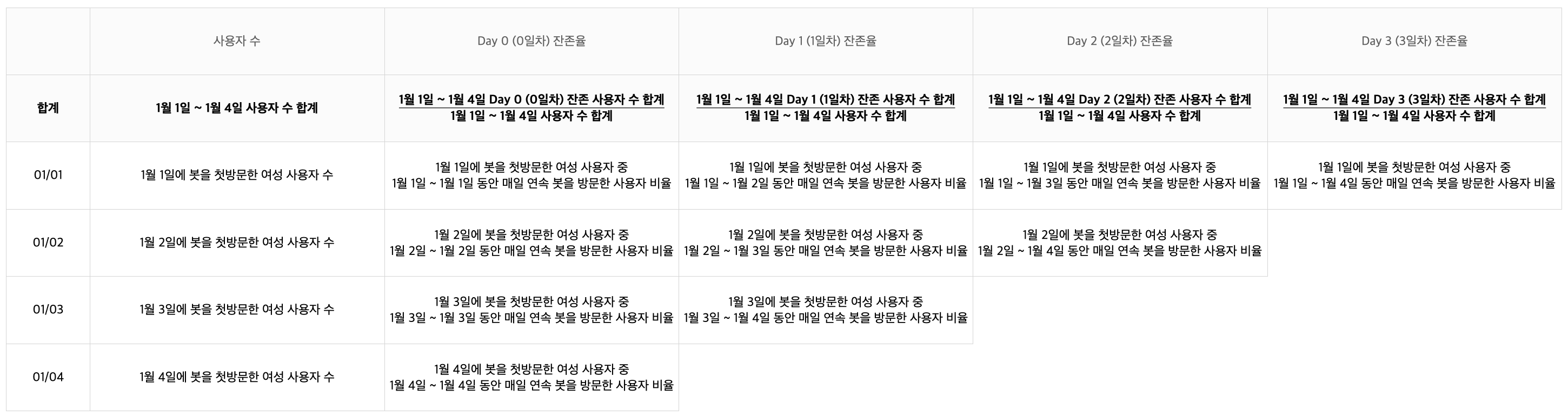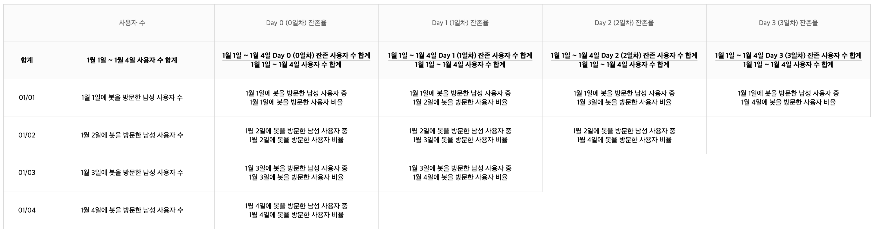* 잔존율 측정 기간 : 1월 1일 \~ 1월 4일 (1월 5일에 측정)