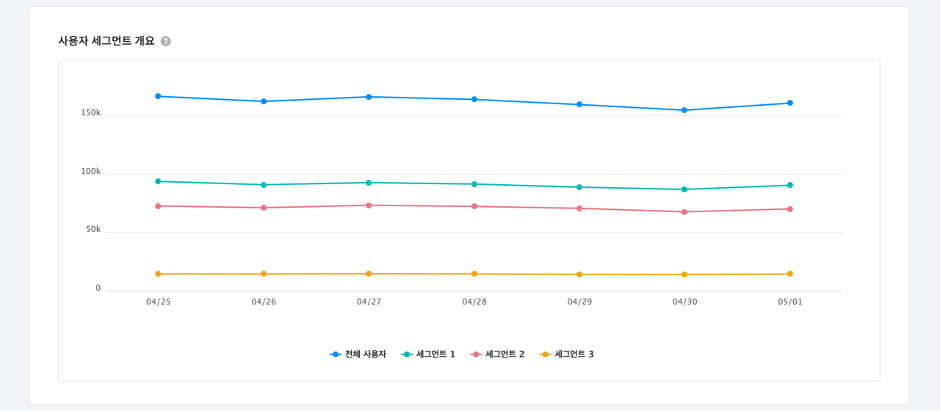 <figure><img src="https://234308570-files.gitbook.io/~/files/v0/b/gitbook-x-prod.appspot.com/o/spaces%2F-MVZVmVOd-5LtENUPqdq%2Fuploads%2FTz6gyjf2mHuXjntVlAX6%2Finsight-4.png?alt=media&#x26;token=6ac8ef5b-de62-475d-971c-209cb654d619" alt=""><figcaption><p>사용자 세그먼트 개요 그래프</p></figcaption></figure>