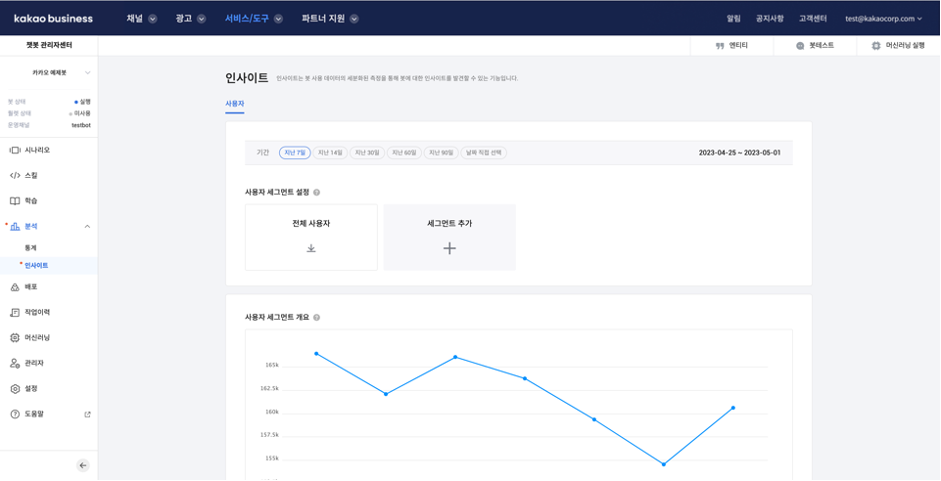 인사이트에서는 봇 사용 데이터의 세분화된 측정을 통해 봇에 대한 인사이트를 발견할 수 있습니다. 인사이트 메뉴에 노출되는 데이터는 \[설정 > 카카오톡 채널 연결 > 운영 채널]에 연결된 챗봇에 전송된 데이터를 기준으로 노출됩니다.