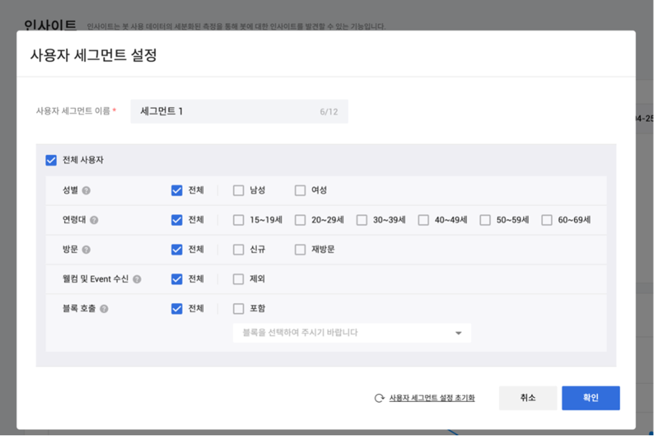 <figure><img src="https://234308570-files.gitbook.io/~/files/v0/b/gitbook-x-prod.appspot.com/o/spaces%2F-MVZVmVOd-5LtENUPqdq%2Fuploads%2FbIAD8g2pUWfeoZboGEw6%2Finsight-2.png?alt=media&#x26;token=a46f06bf-9300-44da-88e6-ee8f0e4bd577" alt=""><figcaption><p>사용자 세그먼트 설정</p></figcaption></figure>
