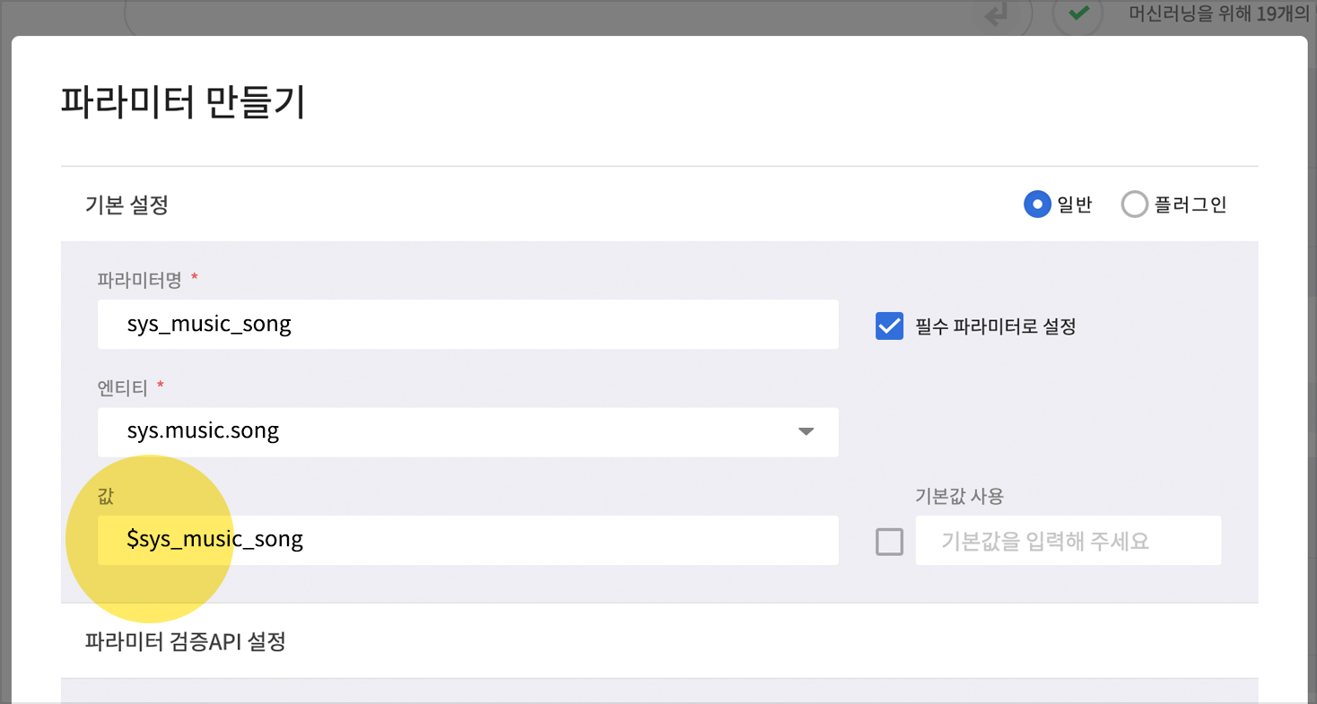 필수 파라미터로 지정되지 않고 사용자의 발화나 이전 또는 현재의 특정 값을 참조하거나, 고정된 값이 설정되어 있지 않을 경우에 ‘기본 값’으로 채택해 사용되는 기본적인 값입니다.