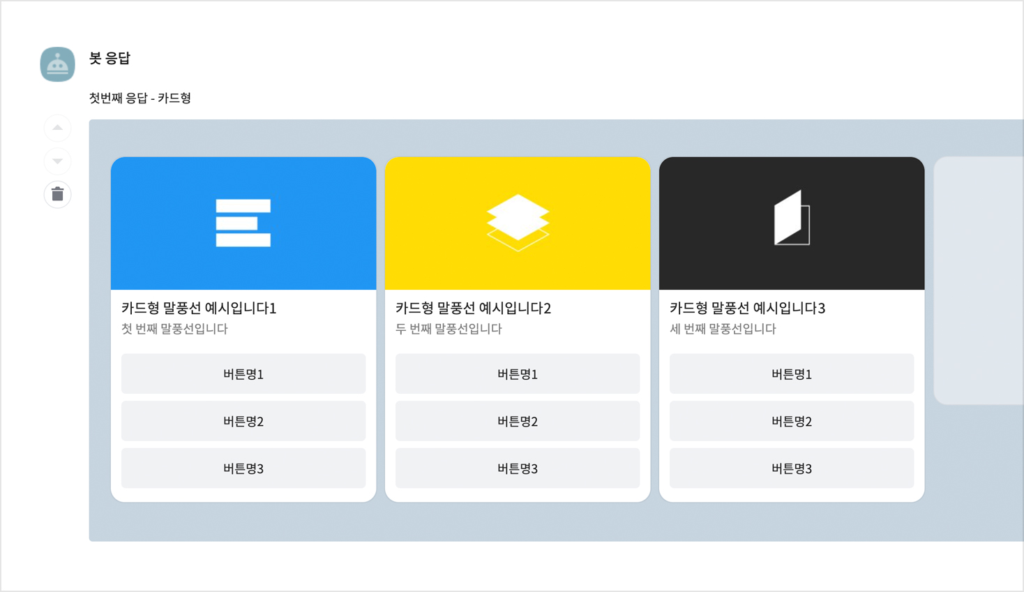 * 카드형 말풍선은 사용자에게 봇 작업자가 이미지, 이미지 / 텍스트, 이미지 / 텍스트 / 버튼으로 조합하여 구성할 수 있는 말풍선 입니다.