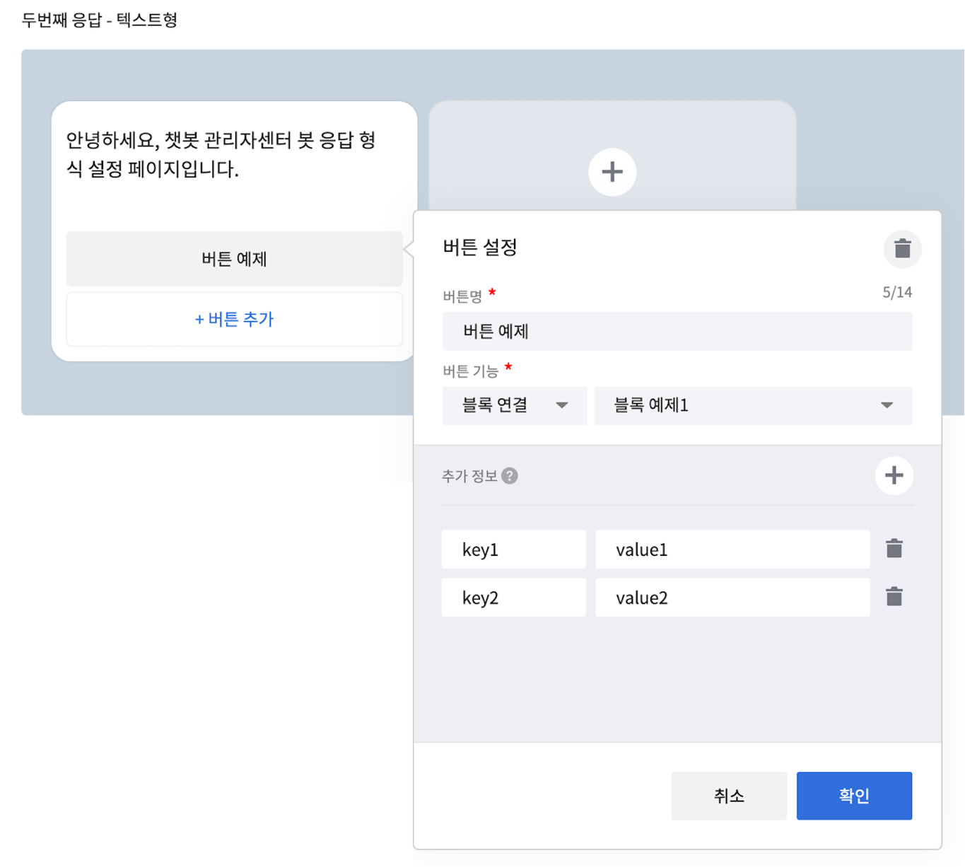 <figure><img src="https://234308570-files.gitbook.io/~/files/v0/b/gitbook-x-prod.appspot.com/o/spaces%2F-MVZVmVOd-5LtENUPqdq%2Fuploads%2F7rG5FaOb6viEIg8cqjRp%2Fbubble-setting.png?alt=media&#x26;token=93dbbaeb-b03c-480c-aaef-d9c0d7231a54" alt=""><figcaption><p>응답 추가 버튼을 눌러 응답 영역 메뉴를 펼친 화면</p></figcaption></figure>