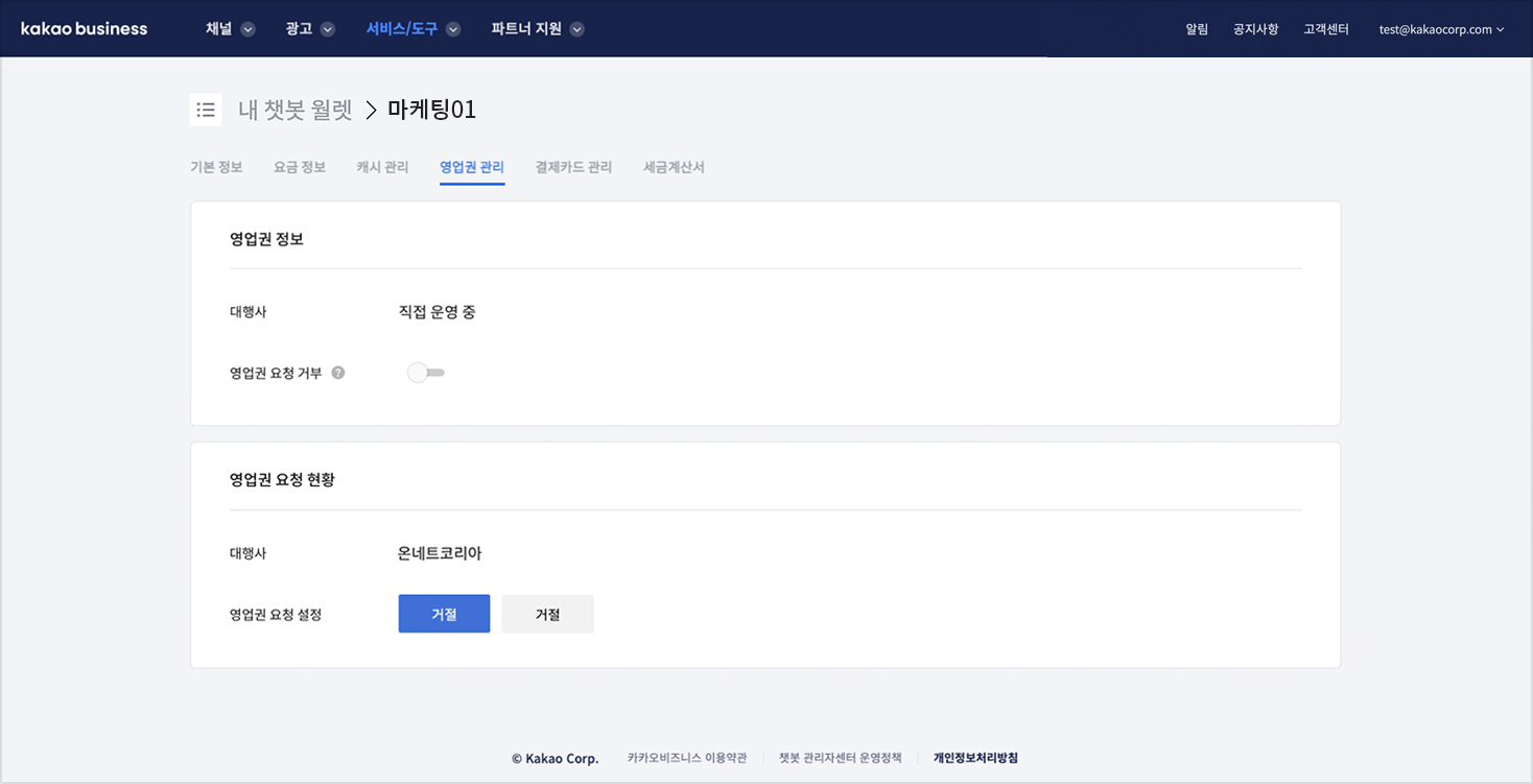 * 월렛에 영업권 설정을 해제해야 합니다. (영업권 해제는 \[챗봇 관리자센터 > 나의 월렛 > 영업권 관리] 에서 가능합니다.)
