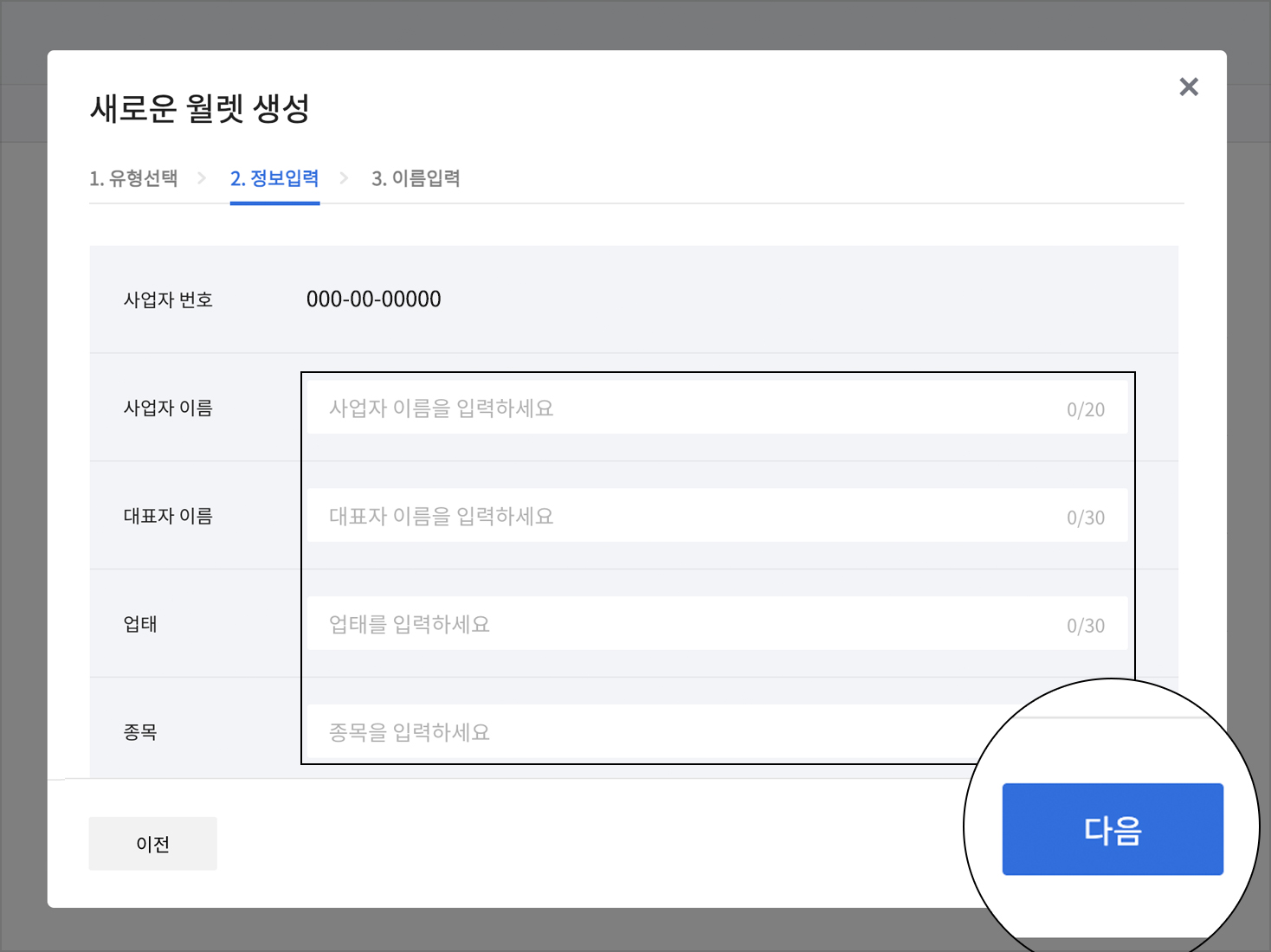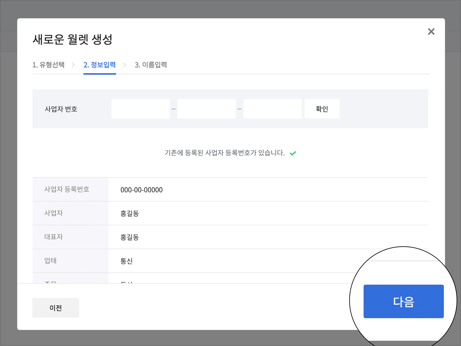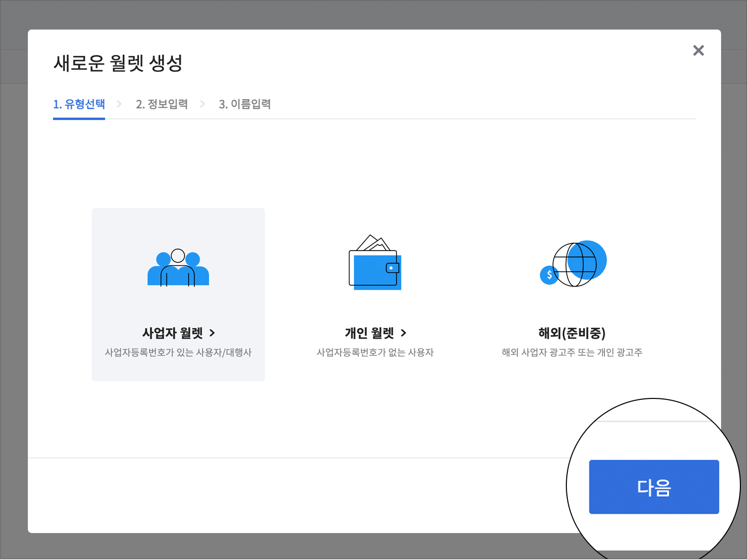 월렛 유형 선택시 사업자 월렛을 선택 후 다음 버튼을 클릭합니다.