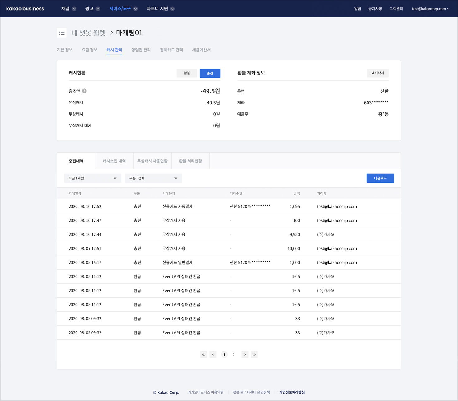 * 충전내역, 캐시 소진내역, 무상캐시 사용현황, 환불 처리현황 탭에서 각 항목을 최대 6개월까지 조회할 수 있으며, 조회결과를 엑셀파일로 다운로드 받을 수 있습니다.