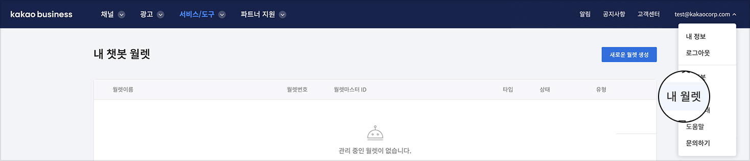 우측 상단 계정 레이어 에서 '내 월렛'을 선택하여 월렛 화면으로 진입할 수 있습니다. 월렛 화면에서는 월렛을 생성하고 관리할 수 있으며, 월렛을 생성한 사람에게는 자동으로 월렛 마스터 권한이 부여됩니다.
