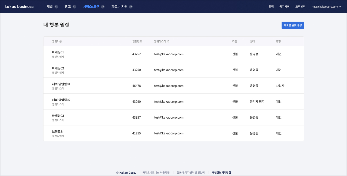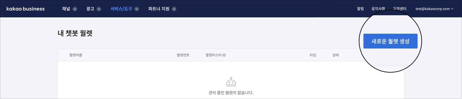 #### Step 1. 내 챗봇 월렛 목록 우측 상단의 새로운 월렛 생성버튼 클릭