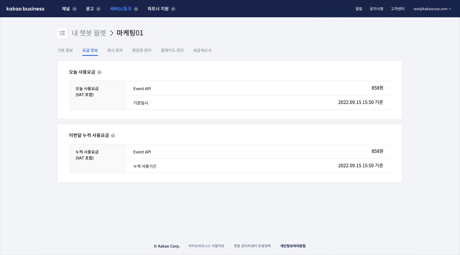 * 요금정보 화면에선 월렛에 연결된 챗봇을 통해서 사용된 유료 사용량을 기준으로 오늘 사용된 요금과 이번달에 사용된 누적 요금 정보를 확인할 수 있습니다.