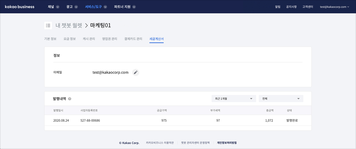 * 세금계산서는 사업자 타입의 월렛에만 노출되며, 월렛을 생성할 때 입력된 사업자등록번호를 기준으로 유료 차감량이 있을 때 매월마다 발행되는 세금계산서 목록을 확인할 수 있습니다.