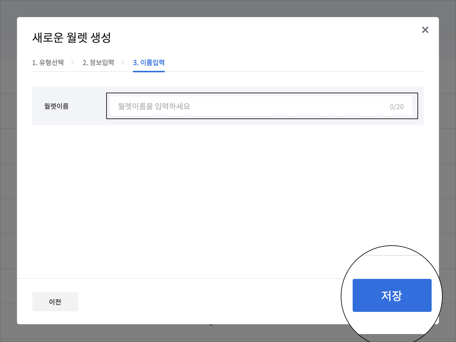 원하는 월렛 이름을 입력 후 저장을 클릭해 월렛 생성을 완료합니다.