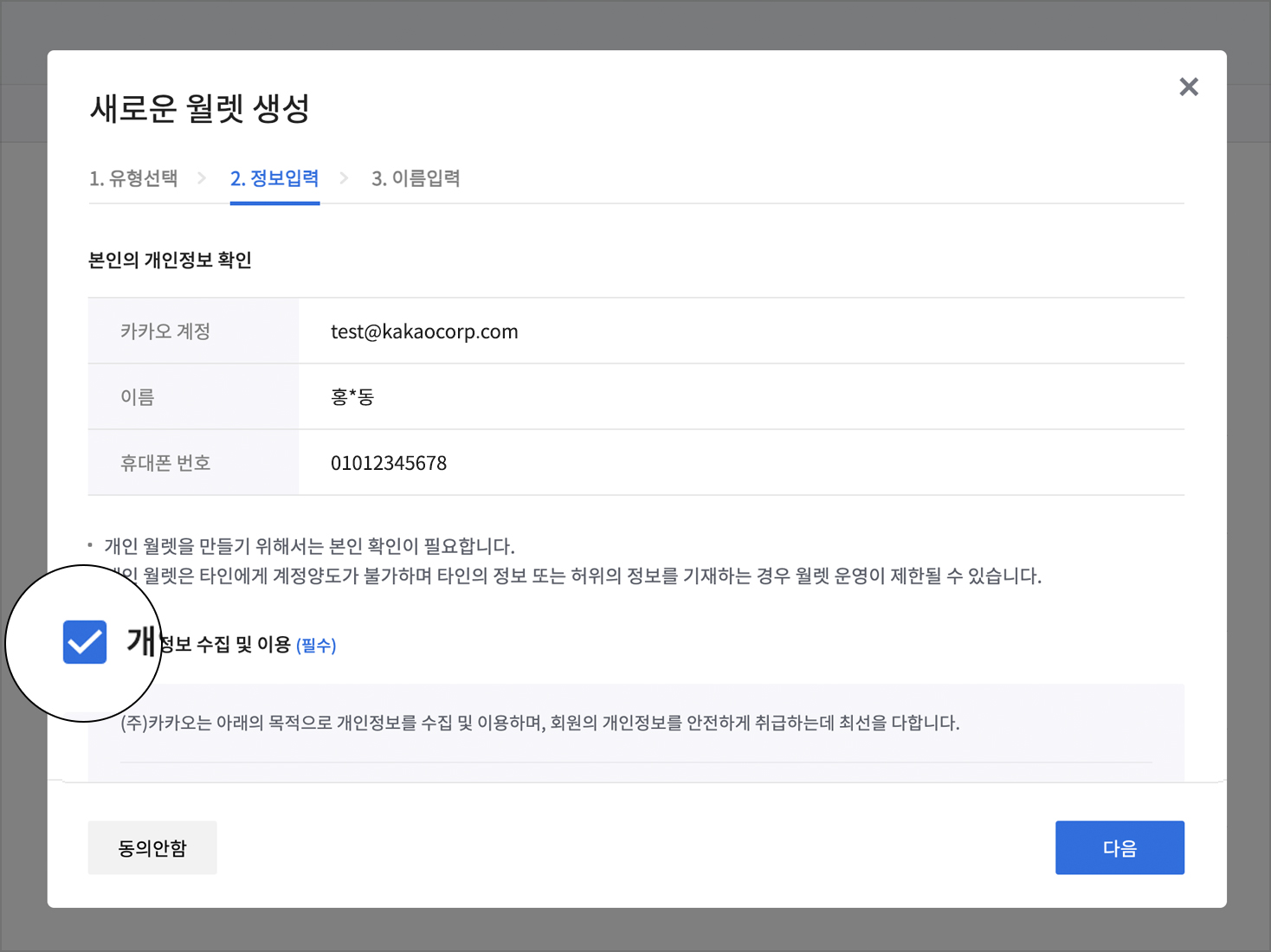 개인정보가 올바르게 입력되어 있는지 확인 후 개인정보 수집 및 이용에 동의합니다. 필수로 동의해야 월렛을 생성할 수 있습니다.