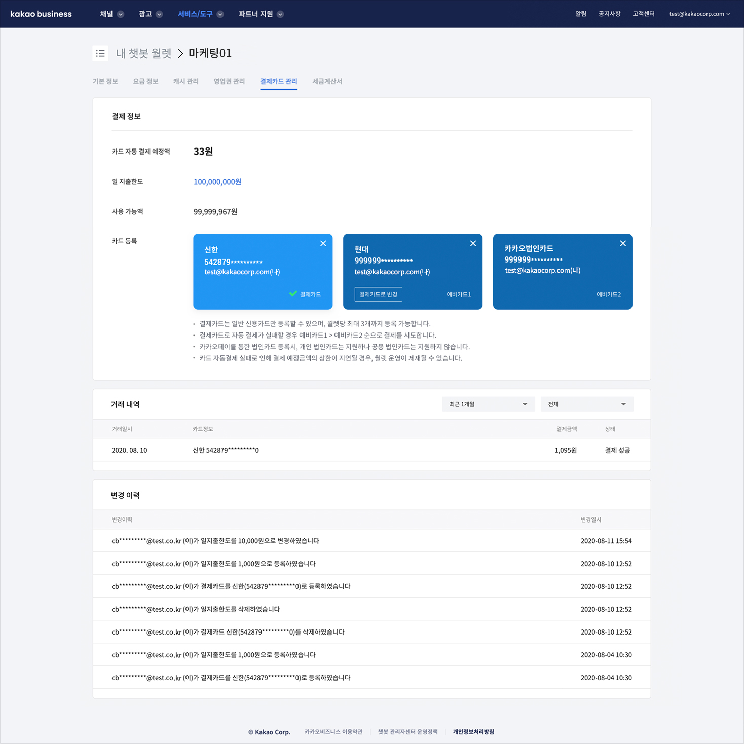 * 예비카드가 등록된 상태에서 결제카드 삭제시 첫 번째 등록된 예비카드가 결제카드로 변경되며, 일 지출한도 및 결제 예정금액을 그대로 이어받게 됩니다.