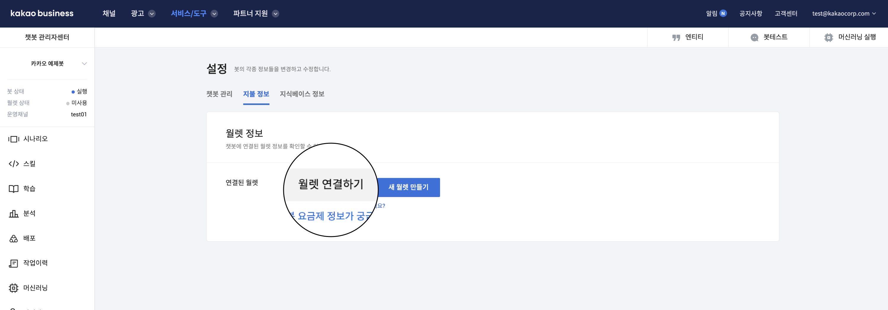 <figure><img src="https://234308570-files.gitbook.io/~/files/v0/b/gitbook-x-prod.appspot.com/o/spaces%2F-MVZVmVOd-5LtENUPqdq%2Fuploads%2FdAYFpHjMc93gnz1gPIiM%2Fwallet-basic-info.png?alt=media&#x26;token=25e7cb24-125f-4d5a-abcb-c0dd75342d2c" alt=""><figcaption><p>월렛 상세 > 기본정보 화면에서 사업자 월렛으로 생성 후 연결된 챗봇이 있을 경우</p></figcaption></figure>